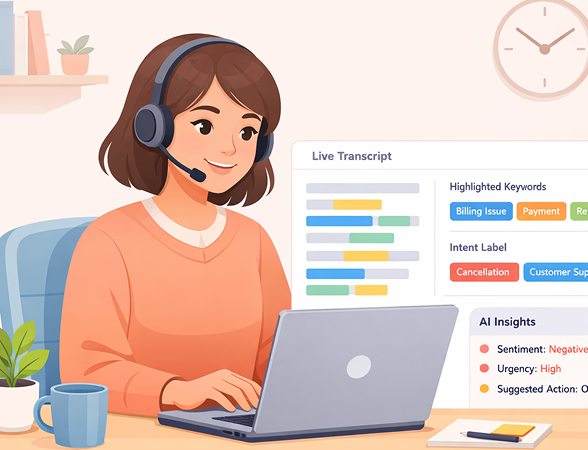 Transcribes conversations in real-time and identifies caller intent. The system captures key topics and surfaces relevant context to help agents understand what callers need. Transcripts remain available for after-call review and quality assurance.